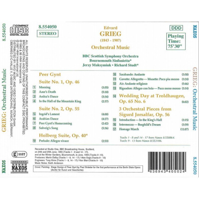 Track List | Peer Gynt Suite No. 1, Op. 46 Peer Gynt Suite No. 2, Op. 55 Holberg Suite, Op. 40 14 Wedding Day At Troldhaugen, Op. 65 No. 6 3 Orchestral Pieces From Sigurd Jorsalfar, Op. 56 |
