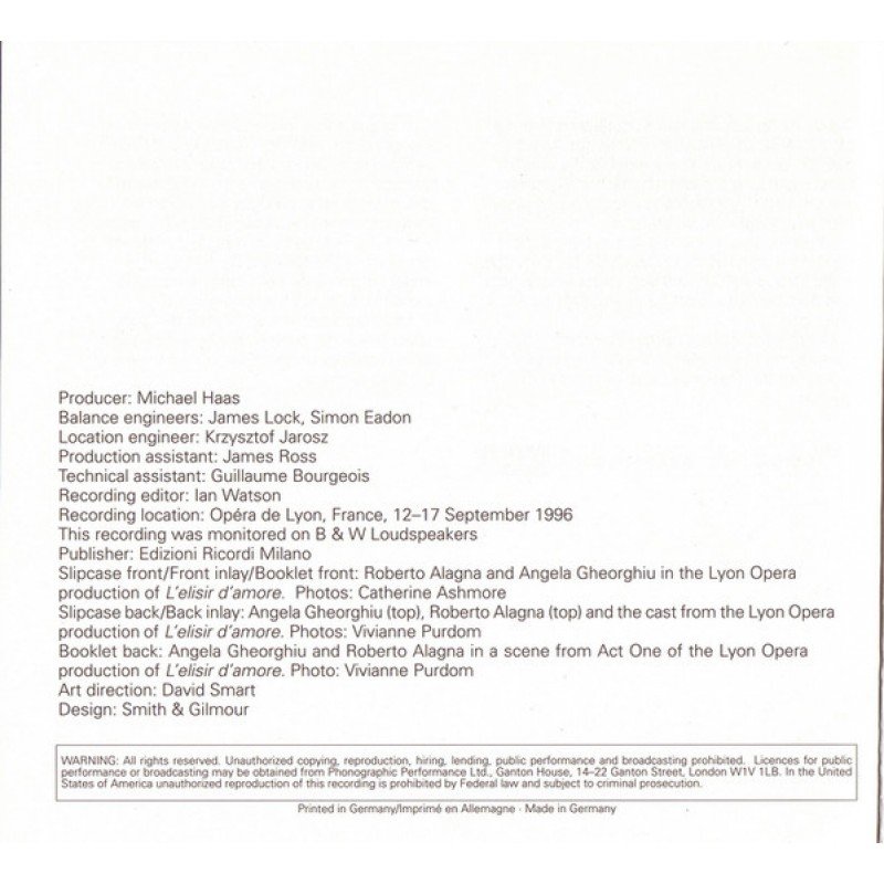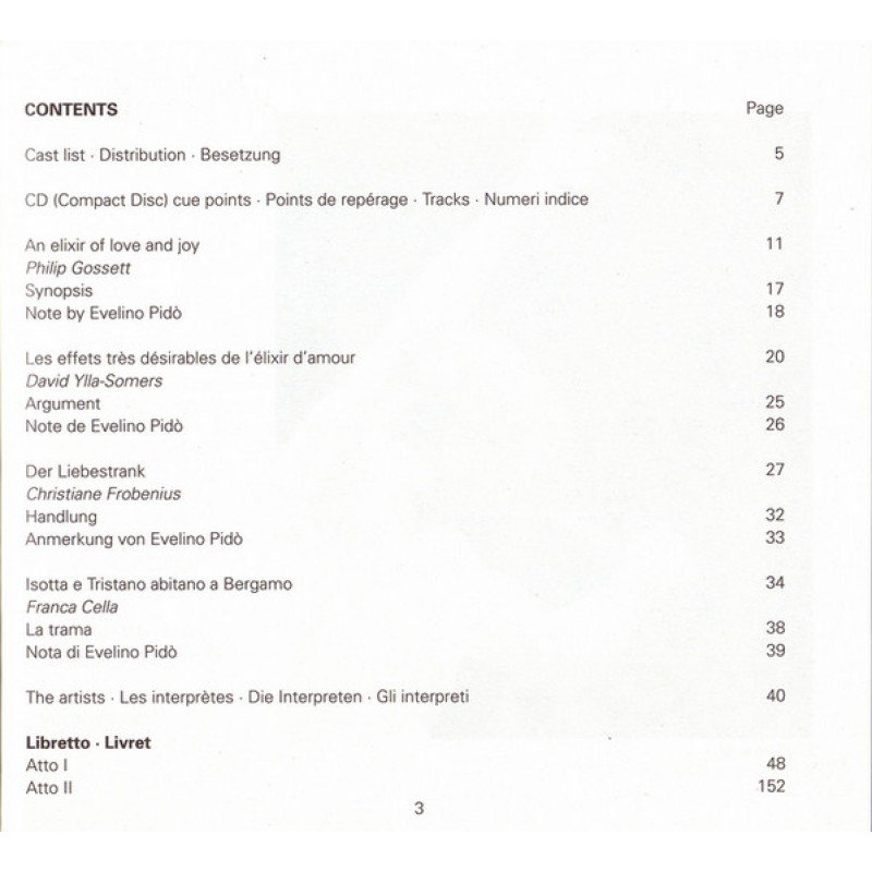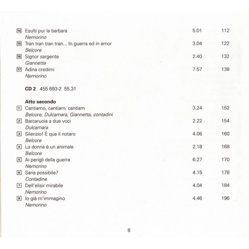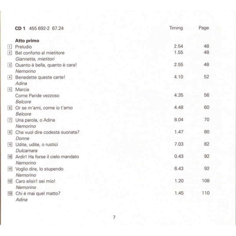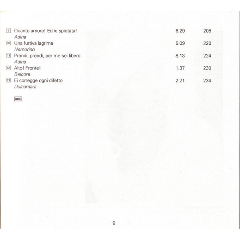 Track List | L'Elisir D'Amore, Opera Atto Primo 1-1 Preludio 1-2 Bel Conforto Al Mietitore 1-3 Quanto È Bella, Quanto È Cara! 1-4 Benedetto Queste Carte! 1-5 Marcia – Come Paride Vezzoso 1-6 Or Se M'Ami, Come Io T'Amo 1-7 Una Parola, O Adina 1-8 Che Vuol Dire Codesta Suonata? |