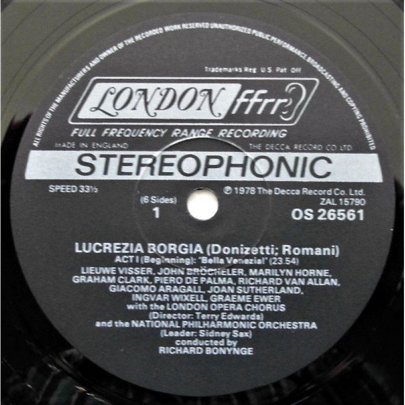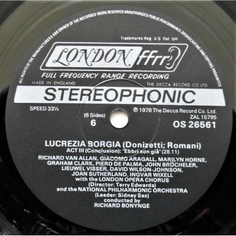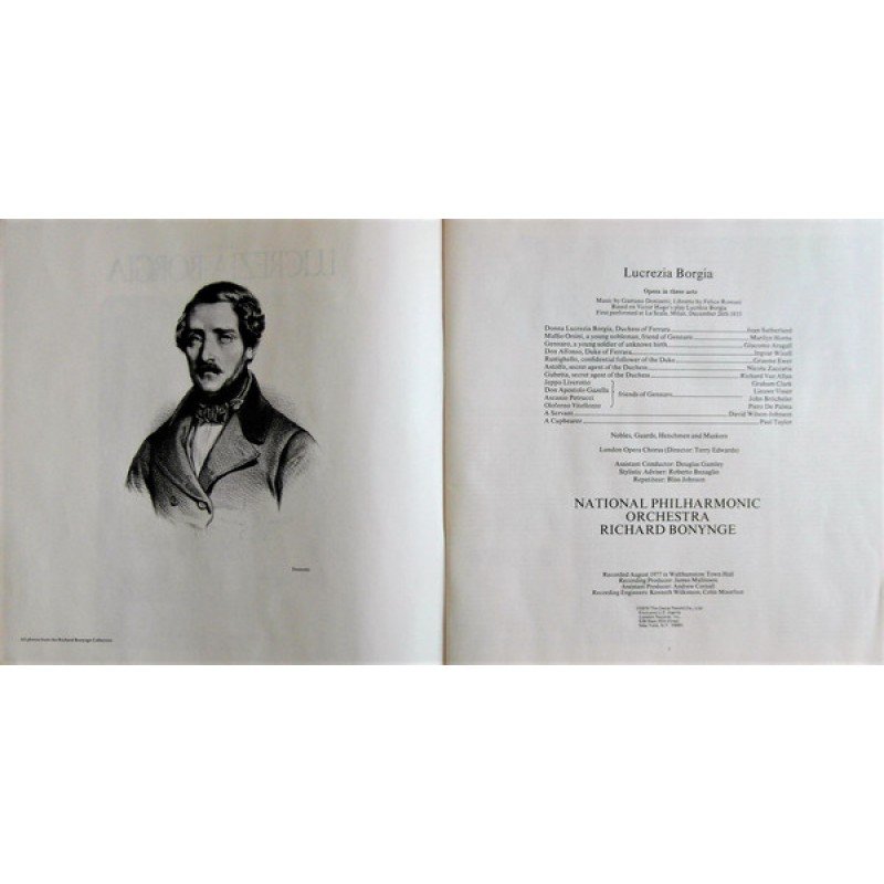 - Front: Color photo picturing 'Lucrezia Borgia' (Sutherland).