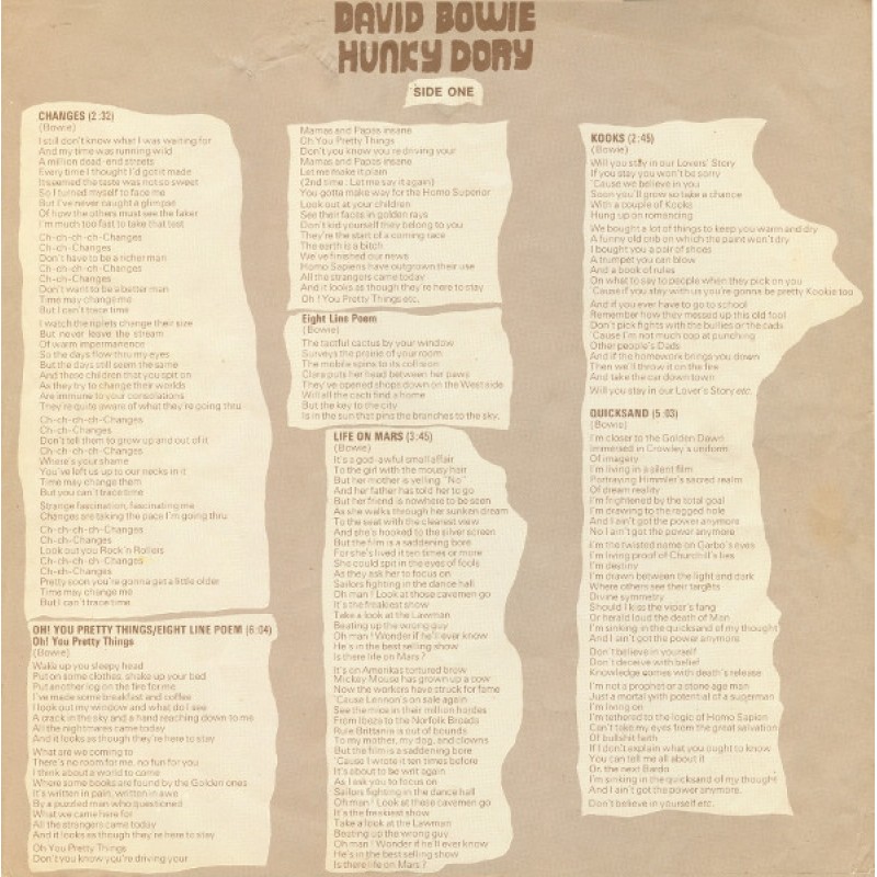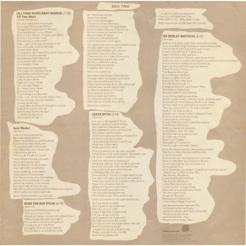 | Track List | A1 Changes A2a Oh! You Pretty Things A2b Eight Line Poem A3 Life On Mars? A4 Kooks A5 Quicksand B1a Fill Your Heart B1b Andy Warhol B2 Song For Bob Dylan B3 Queen Bitch B4 The Bewlay Brothers |