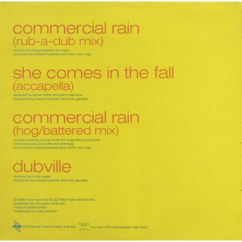 | Track List | A1 Commercial Rain (Rub-A-Dub Mix) A2 She Comes In The Fall (Accapella) B1 Commercial Rain (Hog/Battered Mix) B2 Dubville |