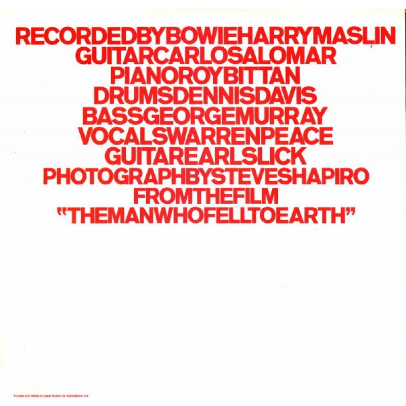 Front photo from the film 'The Man Who Fell To Earth'. Monochrome version of an original full colour shot. The latter was scheduled to be on the cover, per pre release publicity at the time, but was withdrawn just before the LP’s release and replaced with the black and white picture.