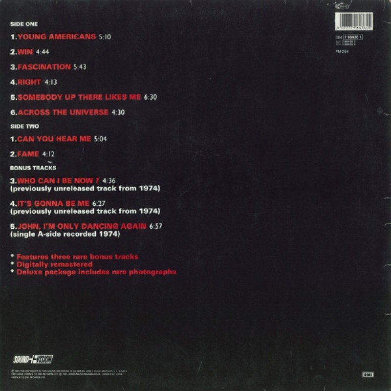 Track List | A1 Young Americans A2 Win A3 Fascination A4 Right A5 Somebody Up There Likes Me A6 Across The Universe B1 Can You Hear Me B2 Fame Bonus Tracks B3 Who Can I Be Now? B4 It's Gonna Be Me B5 John, I'm Only Dancing Again |