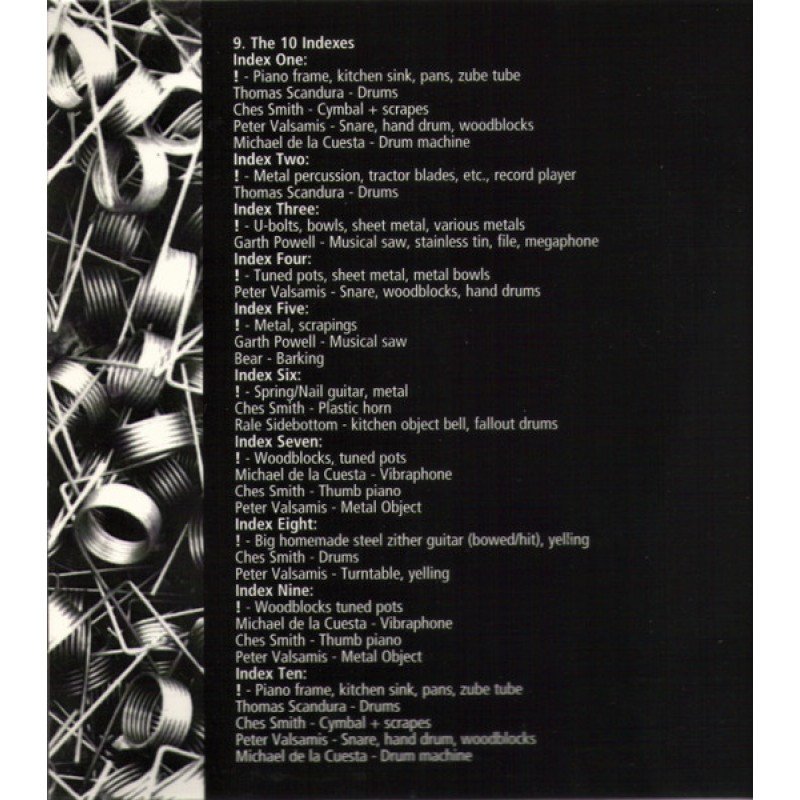 The record used on the record player is an Eric Dolphy record. The 10 Indexes is a single track of ten sections/indexes.All tracks except #5 recorded at the Bomb Shelter in Oakland, California, USA between the 27th of December, 1997 through the 12th of April, 1998. Track 5 was recorded at 2544 3rd Street in San Francisco sometime in 1998. Digital editing and CD mastering was done at the Workhouse Studio 420 in San Jose, 1998. Cover and back photo taken in 2001. Inner photo taken during the recording sessions in 1998. Composed with additional contributions from all.