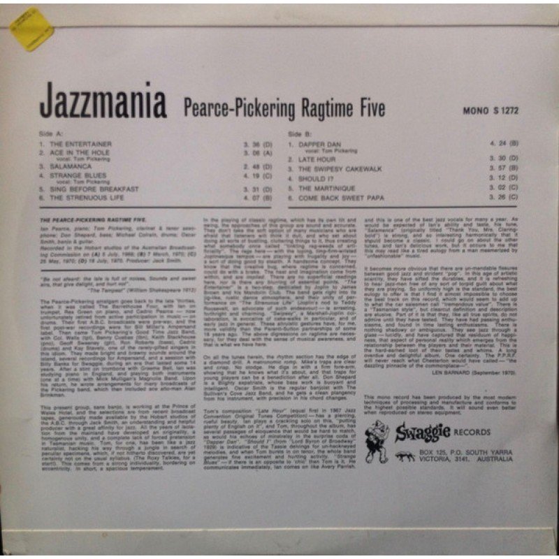 Recorded at Hobart ABC studios 5 July 1969, 7 March 1970, 25 May 1970 and 18 July 1970.Tasmanian jazz band.