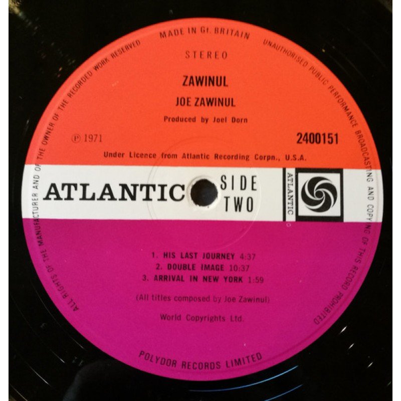 Red / Purple Atlantic label: Made in Gt. BritainMusic for two electric pianos, flute, trumpet, soprano saxophone, two contrabasses and percussion.