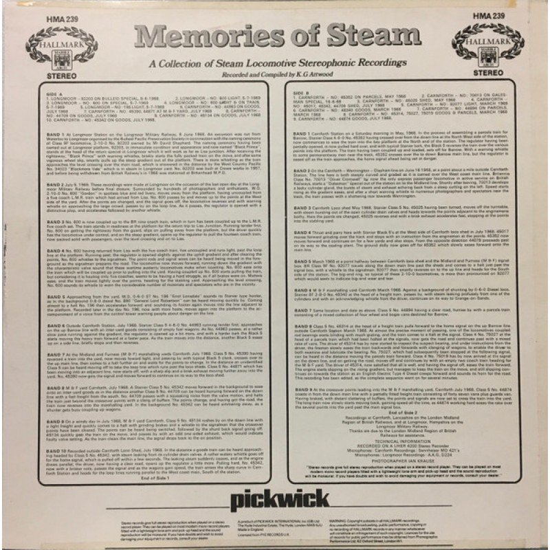 A collection of Steam Locomotive Stereophonic RecordingsRecordings at Carnforth, Lancashire on the London Midland Region of British Railways, and at Longmoor, Hampshire on the Longmoor Military Railway.