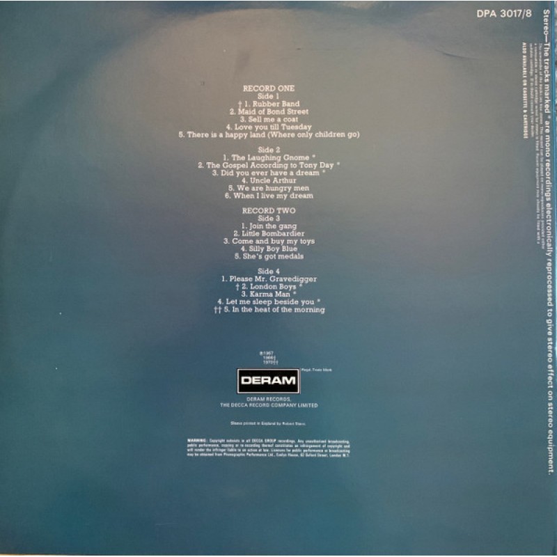 The face labels of sides A to C of this version differ as they have the RPM printed on them, the total number of sides is listed in parenthesis and the "double album" term on these faces is printed below not above the side numbering. The side D face label is identical but without the Mono recording remark on the label