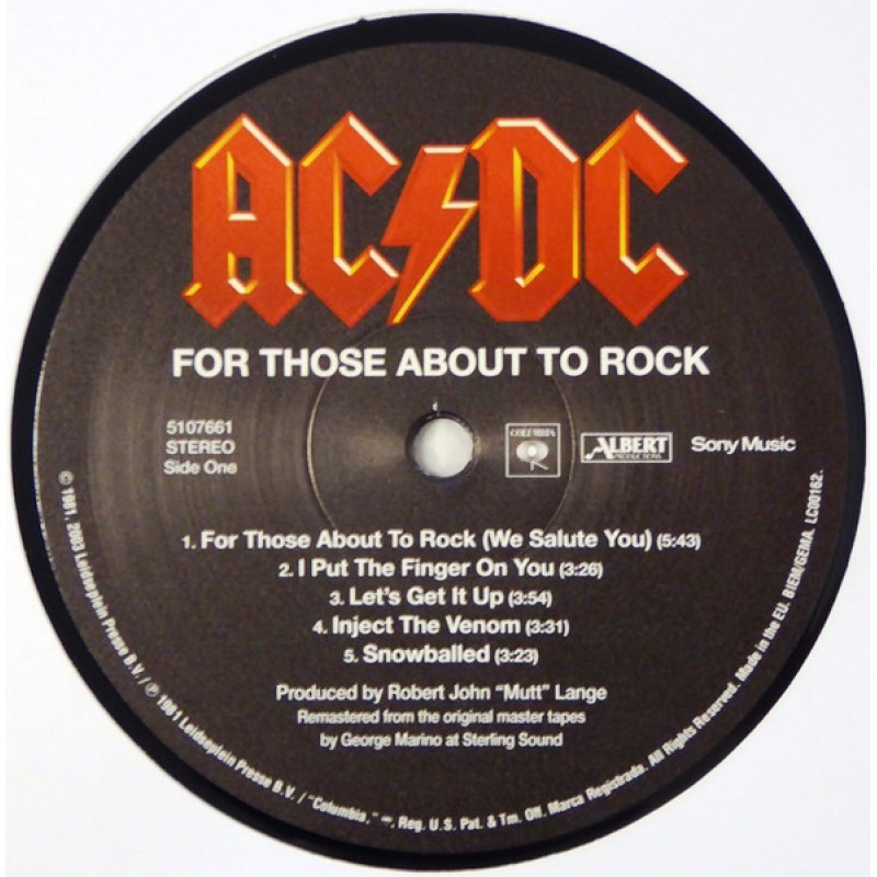 | Track List | A1 For Those About To Rock (We Salute You) A2 I Put The Finger On You A3 Let's Get It Up A4 Inject The Venom A5 Snowballed B1 Evil Walks B2 C.O.D. B3 Breaking The Rules B4 Night Of The Long Knives B5 Spellbound |