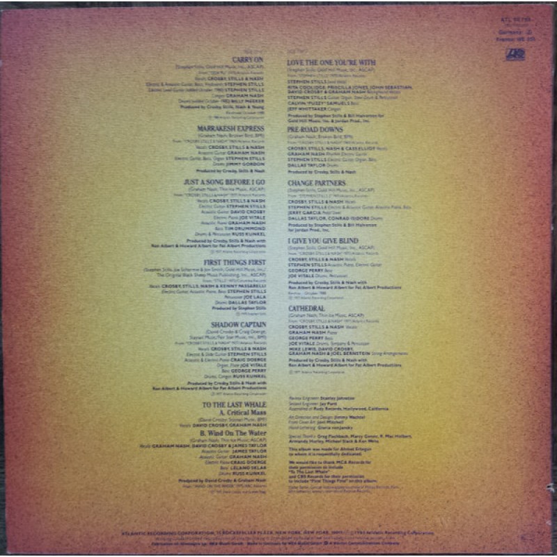 | Track List | A1 Carry On A2 Marrakesh Express A3 Just A Song Before I Go A4 First Things First A5 Shadow Captain A6a To The Last Whale - A. Critical Mass A6b To The Last Whale - B. Wind On The Water B1 Love The One You're With B2 Pre-Road Downs B3 Change Partners B4 I Give You Give |