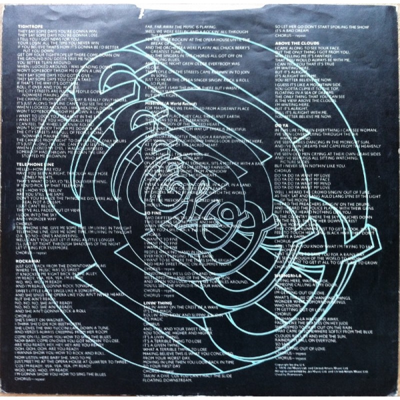 | Track List | A1 Tightrope A2 Telephone Line A3 Rockaria! A4 Mission (A World Record) B1 So Fine B2 Livin' Thing B3 Above The Clouds B4 Do Ya B5 Shangri-La |