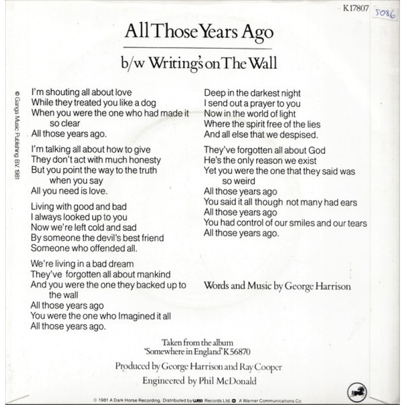 | Track List | A All Those Years Ago B Writing's On The Wall |