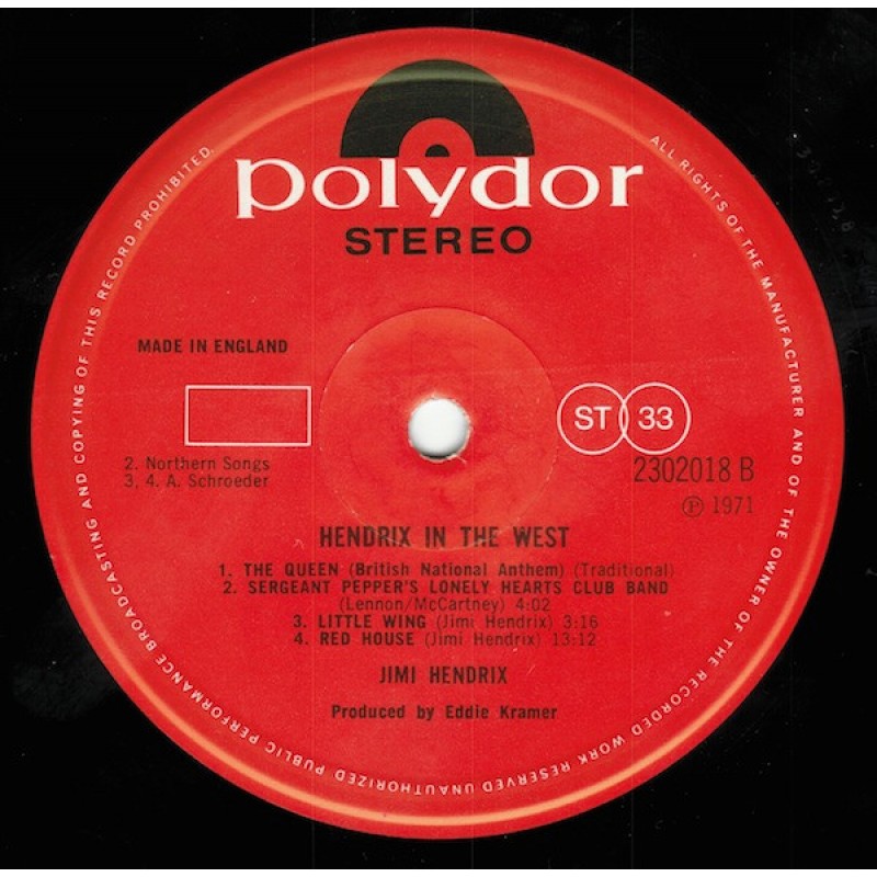 One of the few official releases after his death. The album is composed of good performances from different concerts between 1968 and 1970.Label pressing-ring variation: label has a ridge present instead of smooth labels on Jimi Hendrix -https://www.discogs.com/release/12491760-Jimi-Hendrix-Hendrix-In-The-West