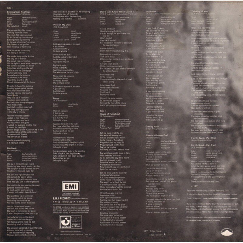 Released in a textured, unlaminated gatefold sleeve to look like skin. This is the first edition without the boxed EMI logo on the record label.℗ 1971