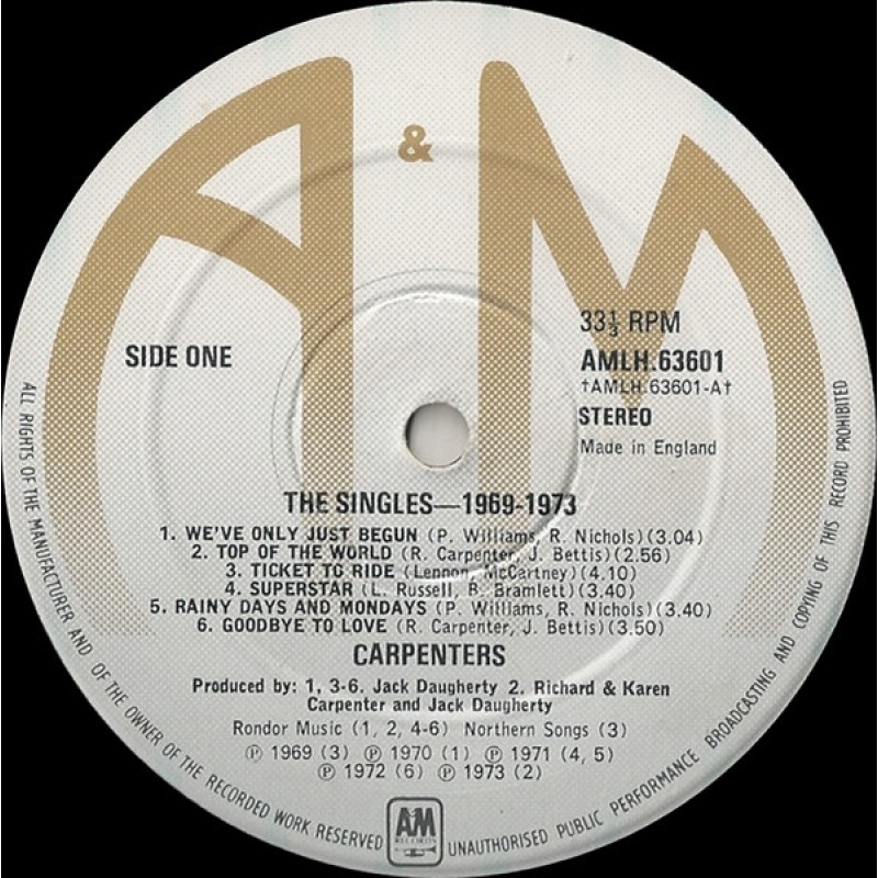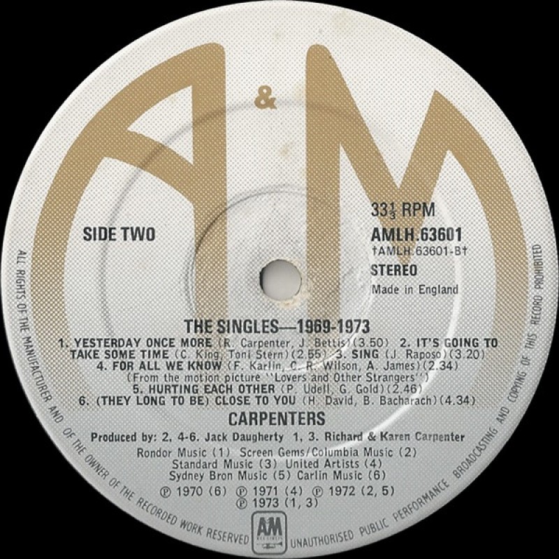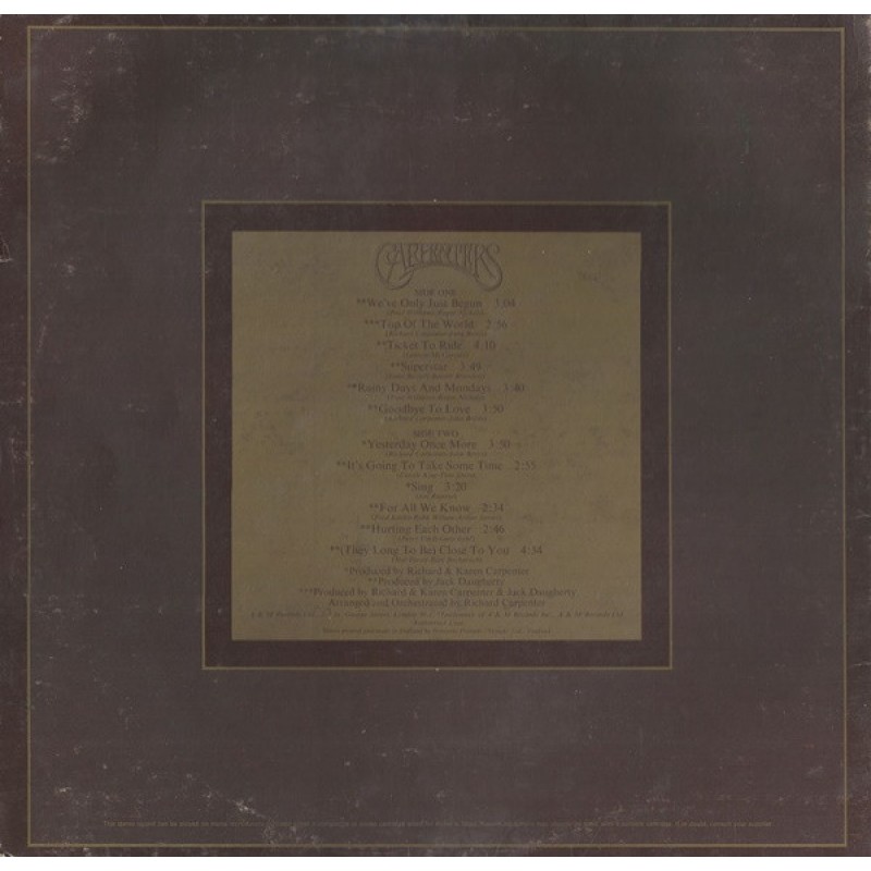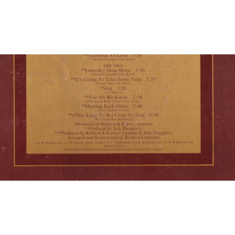 | Track List | A1 We've Only Just Begun A2 Top Of The World A3 Ticket To Ride A4 Superstar A5 Rainy Days And Mondays A6 Goodbye To Love B1 Yesterday Once More B2 It's Going To Take Some Time B3 Sing B4 For All We Know B5 Hurting Each Other B6 (They Long To Be) Close To You |