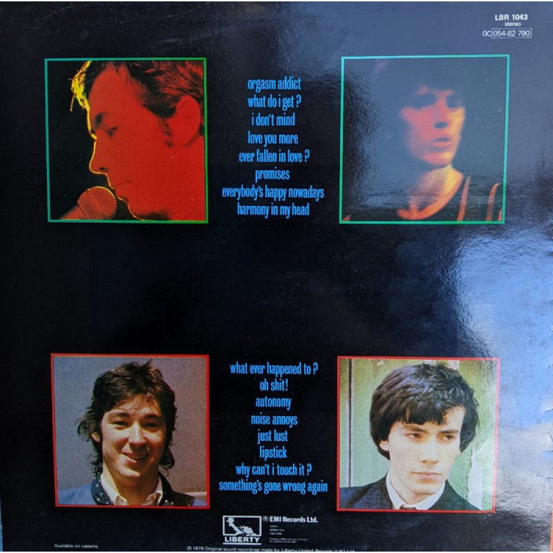 | Track List | A1 Orgasm Addict A2 What Do I Get? A3 I Don't Mind A4 Love You More A5 Ever Fallen In Love? A6 Promises A7 Everybody's Happy Nowadays A8 Harmony In My Head B1 Whatever Happened To? B2 Oh Shit! B3 Autonomy B4 Noise Annoys B5 Just Lust B6 Lipstick B7 W |