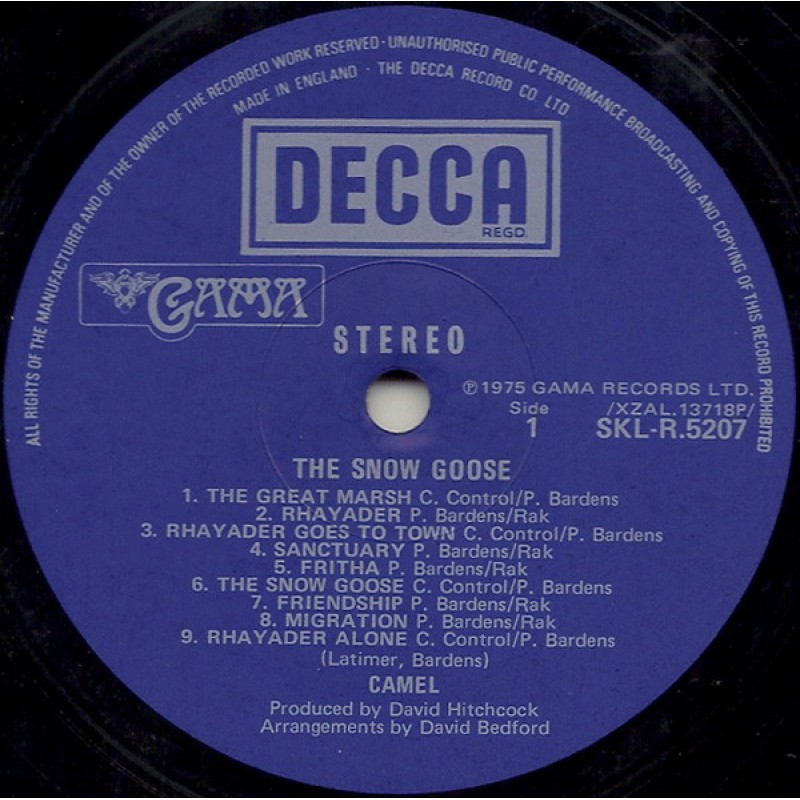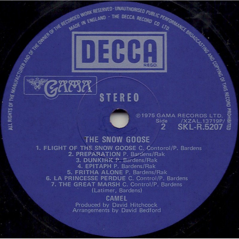 | Track List | A1 The Great Marsh A2 Rhayader A3 Rhayader Goes To Town A4 Sanctuary A5 Fritha A6 The Snow Goose A7 Friendship A8 Migration A9 Rhayader Alone B1 Flight Of The Snow Goose B2 Preparation B3 Dunkirk B4 Epitaph B5 Fritha Alone B6 La Princesse Perdue |