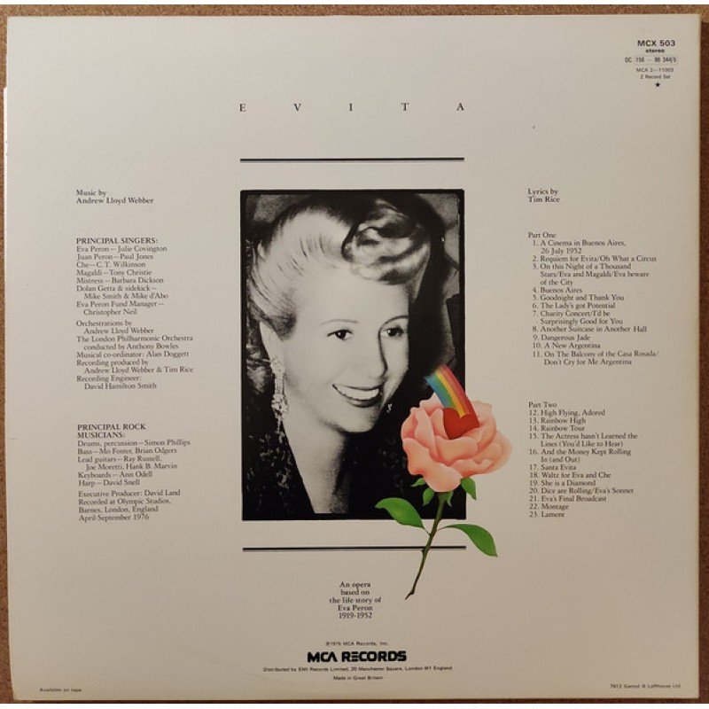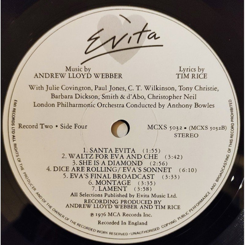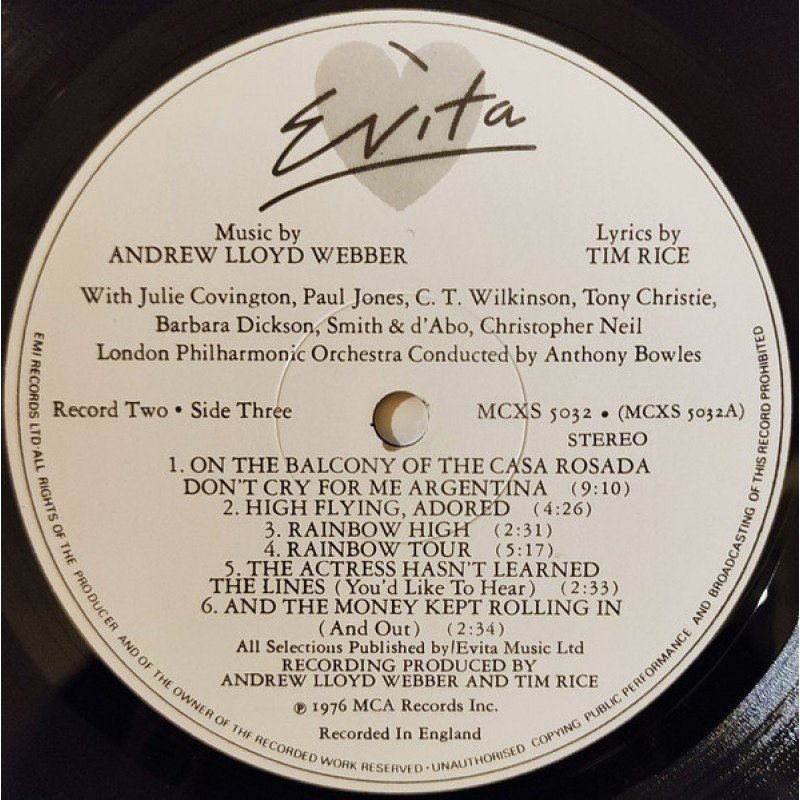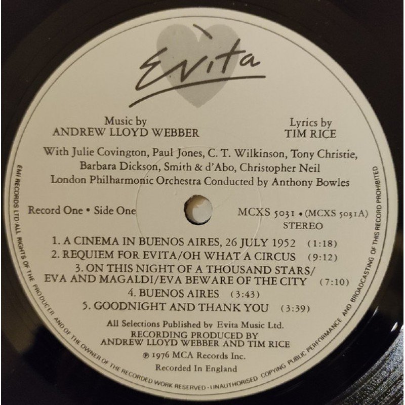 Track List | A1 A Cinema In Buenos Aires, 26 July 1952 A2 Requiem For Evita / Oh What A Circus A3 On This Night Of A Thousand Stars / Eva And Magaldi / Eva Beware Of The City A4 Buenos Aires A5 Goodnight And Thank You B1 The Lady's Got Potential B2 Charity Concert / I'd Be Surprisingly Good For You |
