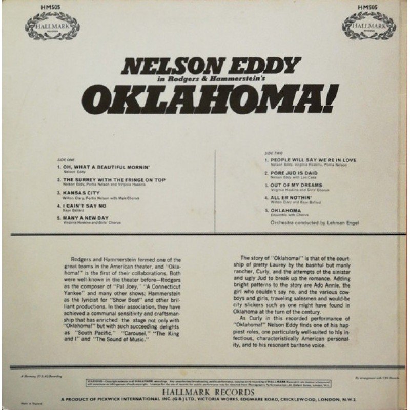 Track List | A1 Oh What A Beautiful Morning A2 The Surrey With A Fringe On Top A3 Kansas City A4 I Cain't Say No A5 Many A New Day B1 People Will Say We're In Love B2 Pore Jud Is Daid B3 Out Of My Dreams B4 All Er Nothin' B5 Oklahoma |