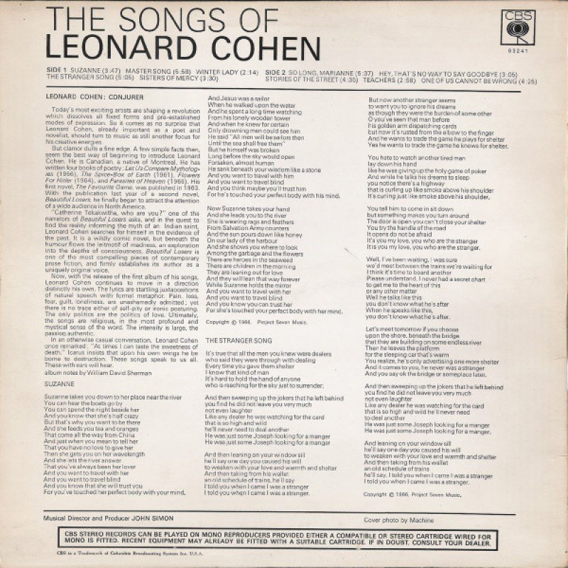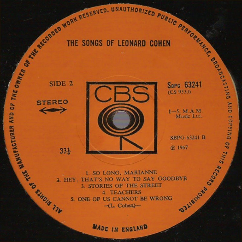 Track List | The Songs Of Leonard Cohen A1 Suzanne A2 Master Song A3 Winter Lady A4 The Stranger Song A5 Sisters Of Mercy B1 So Long, Marianne B2 Hey, That's No Way To Say Goodbye B3 Stories Of The Street B4 Teachers B5 One Of Us Cannot Be Wrong |