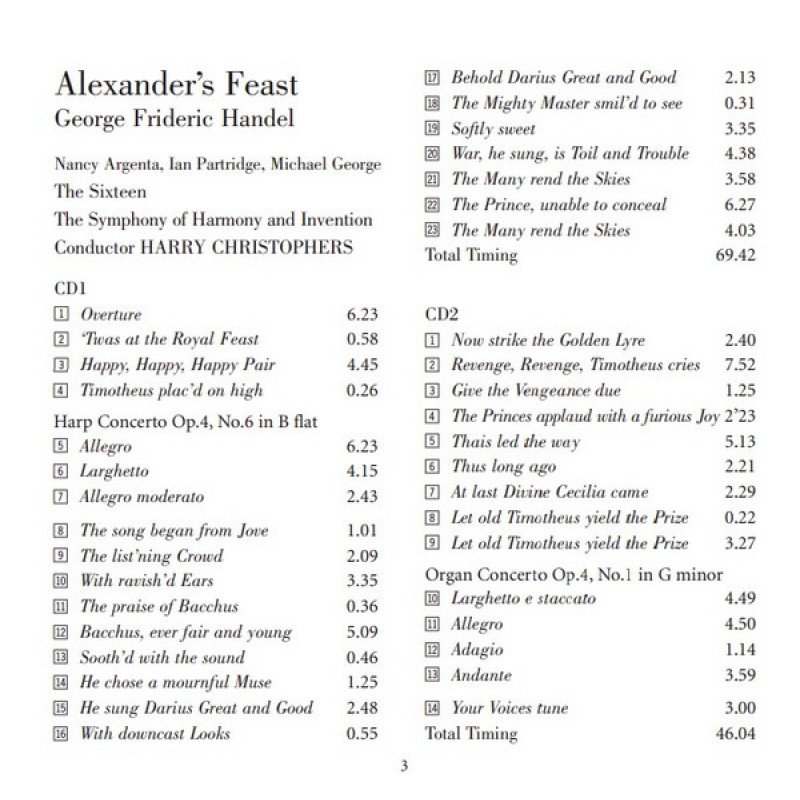 | Track List | 1-1 Overture 1-2 ‘Twas At The Royal Feast 1-3 Happy, Happy, Happy Pair 1-4 Timotheus Plac’d On High Harp Concerto Op.4, No.6 In B Flat 1-8 The Song Began From Jove 1-9 The List’ning Crowd 1-10 With Ravish’d Ears 1-11 The Praise Of Bacchus 1-12 Bacchus, Ever Fair And |