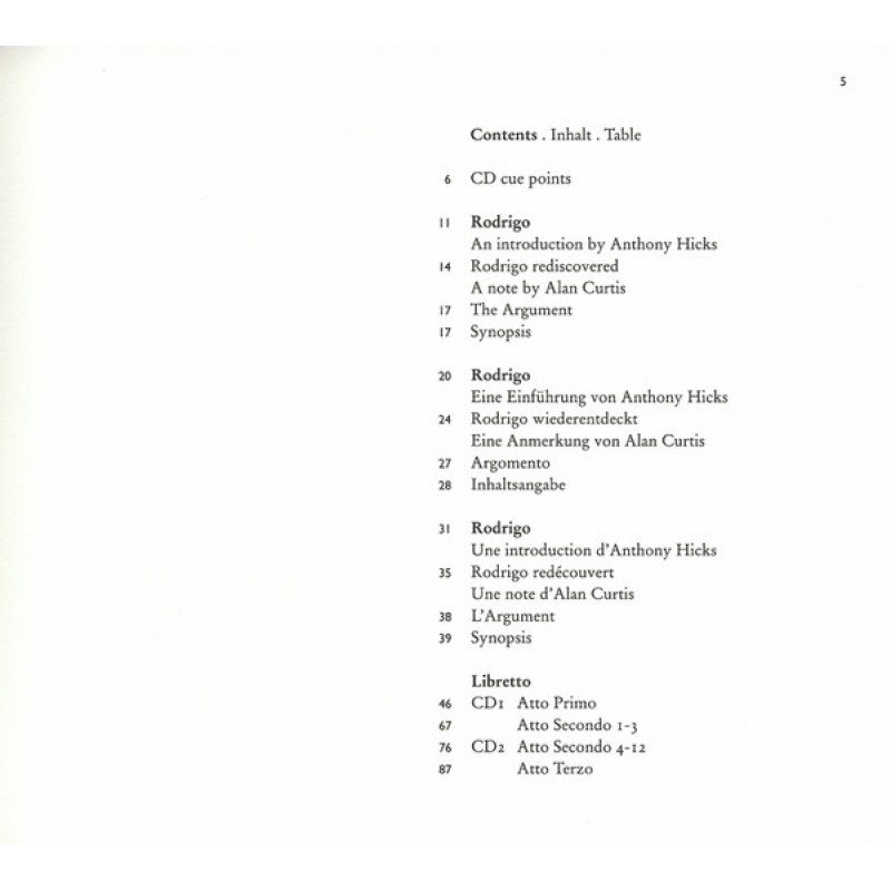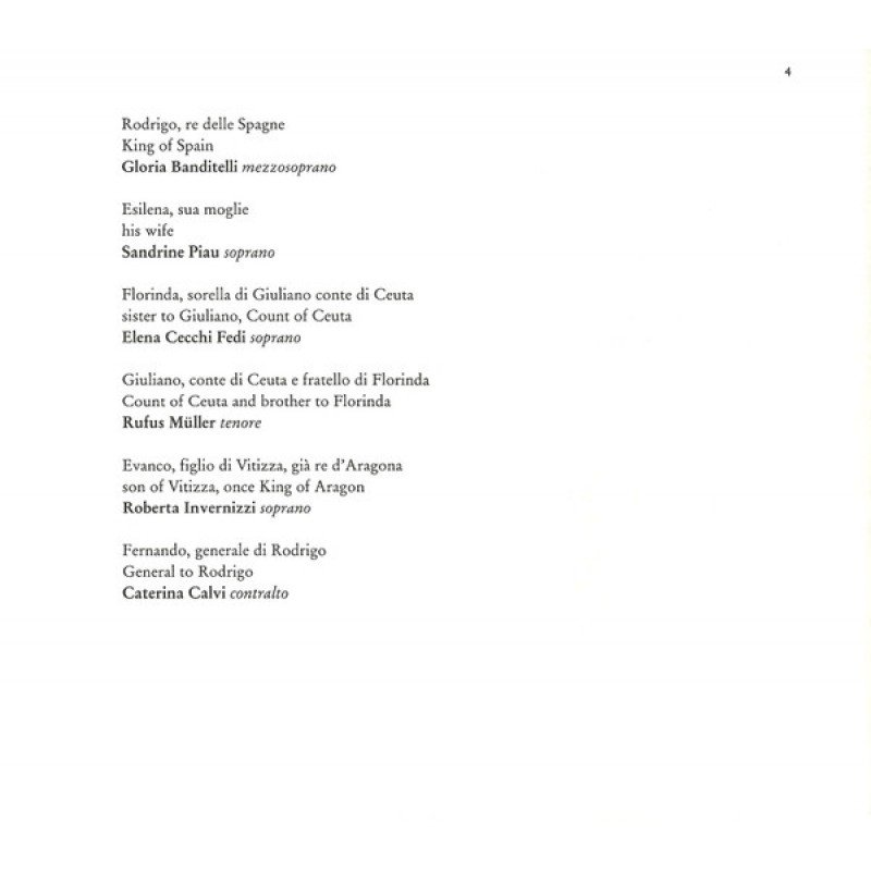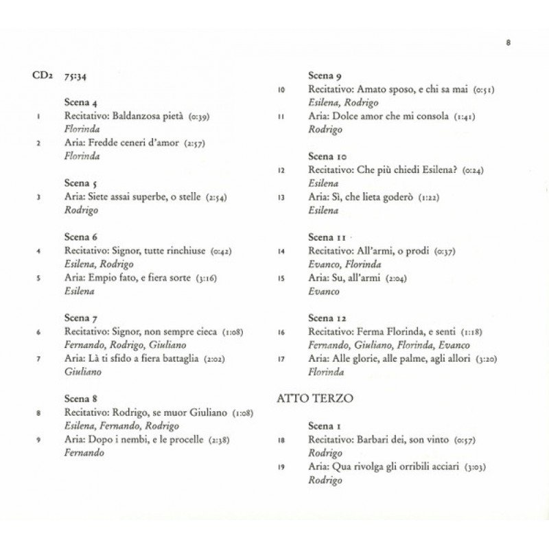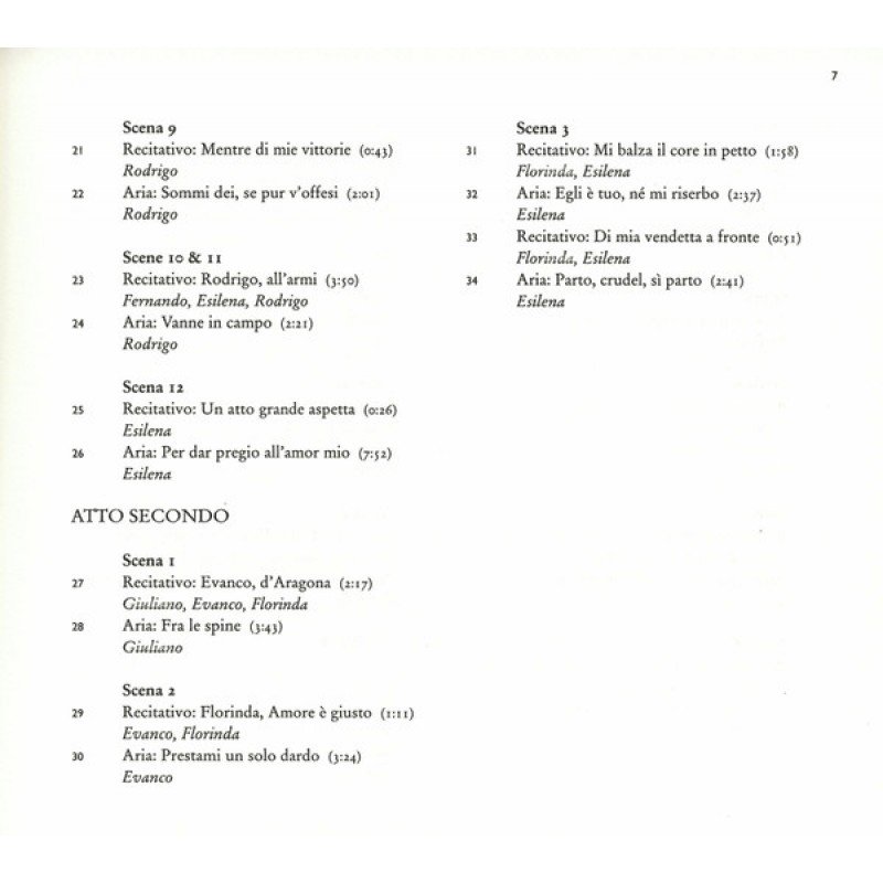 Track List | Rodrigo, Opera, HWV 5 1-1 Overture Atto Primo 1-2 Recitativo Accompagnato: Ah Mostro, Ah Furia (Florinda, Rodrigo) 1-3 Aria: Occhi Neri (Rodrigo) 1-4 Recitativo: E Tal Mi Lascia? (Florinda) 1-5 Aria: Pugneran Con Noi Le Stelle (Florida) 1-6 Aria: Nasce Il Sol, E L'Aura Vola (Esilena |