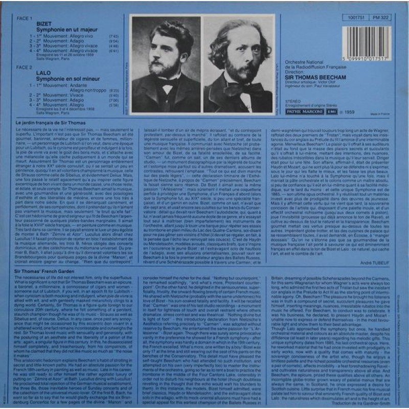 Bizet*, Lalo*, Sir Thomas Beecham, Orchestre National De La Radiodiffusion Française* - Symphonie En Ut Majeur - Symphonie En Sol Mineur (LP, RE)