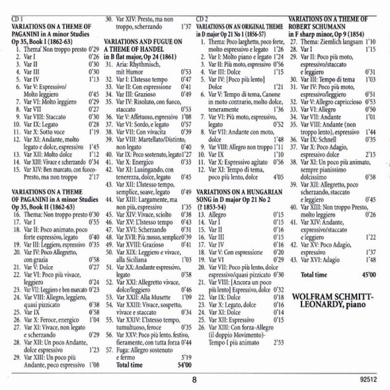 Track List | Variations On A Theme Of Paganini In A Minor Studies Op. 35, Book I (1862-1863) 1-1 Thema' Non Troppo Presto 1-2 Var I 1-3 Var II 1-4 Var III 1-5 Var IV 1-6 Var V: Espressivo/Molto Leggiero 1-7 Var VI: Molto Leggiero 1-8 Var VII 1-9 Var VIII: Staccato 1-10 Var IX: Lega |