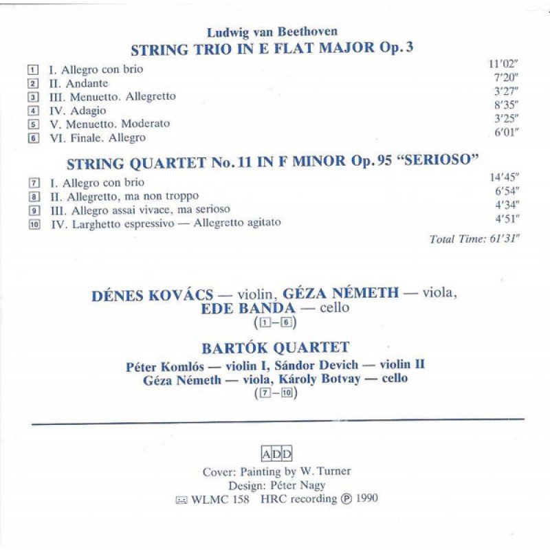 Track List | String Trio In E Flat Major Op. 3 String Quartet No. 11 In F Major Op. 95 "Serioso" |