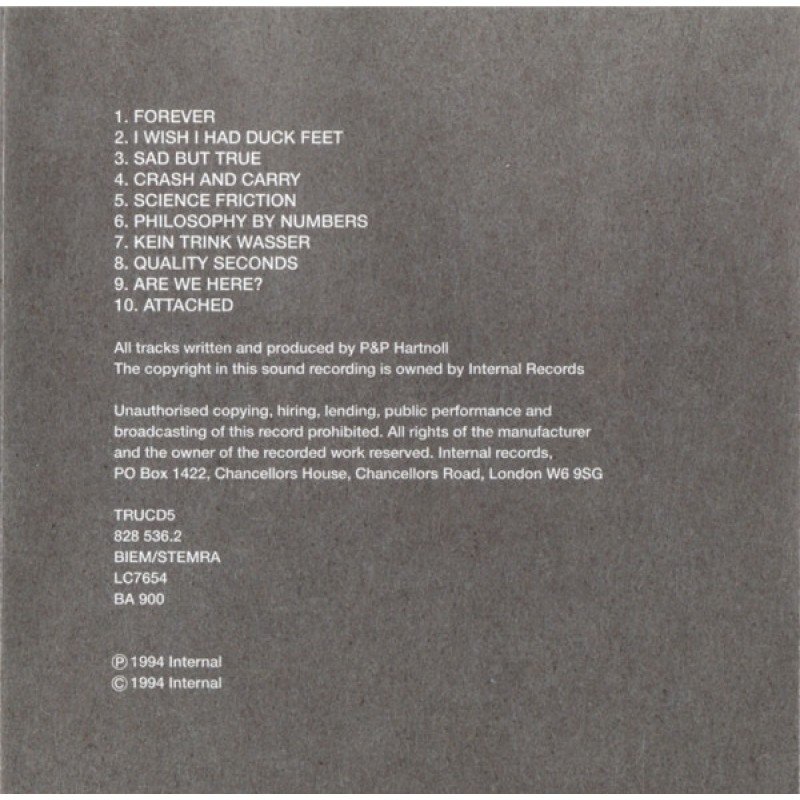 | Track List | 1 Forever 2 I Wish I Had Duck Feet 3 Sad But True 4 Crash And Carry 5 Science Friction 6 Philosophy By Numbers 7 Kein Trink Wasser 8 Quality Seconds 9 Are We Here? 10 Attached |