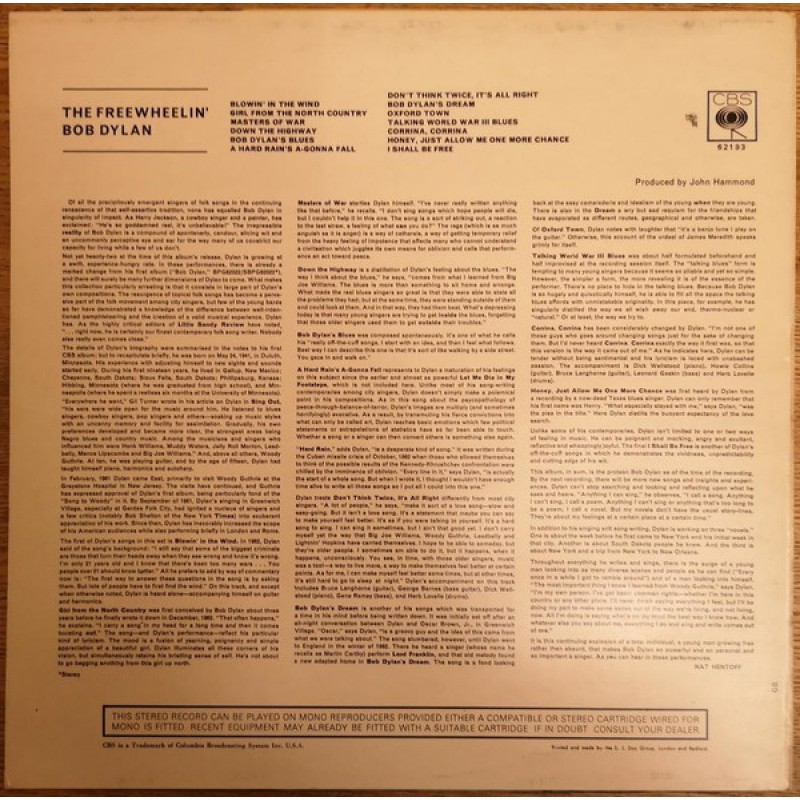 | Track List | A1 Blowin' In The Wind A2 Girl From The North Country A3 Masters Of War A4 Down The Highway A5 Bob Dylan's Blues A6 A Hard Rain's A-Gonna Fall B1 Don't Think Twice, It's All Right B2 Bob Dylan's Dream B3 Oxford Town B4 Talking World War III Blues B5 Corrina, Corrina |