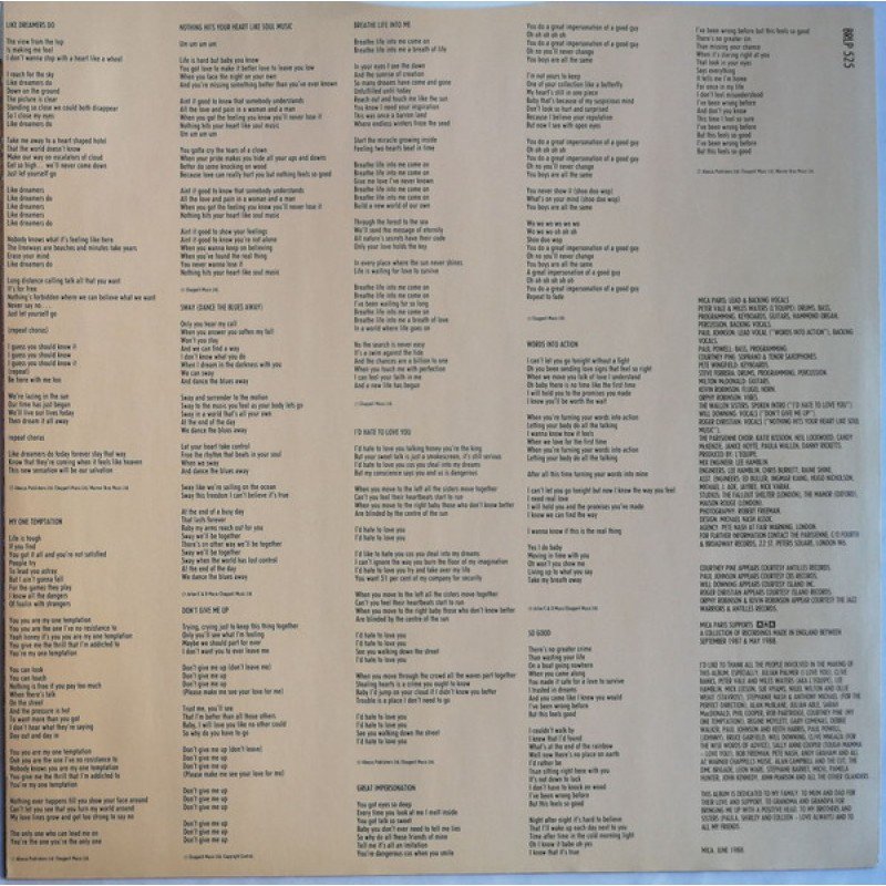| Track List | A1 Like Dreamers Do A2 My One Temptation A3 Nothing Hits Your Heart Like Soul Music A4 Sway (Dance The Blues Away) A5 Don't Give Me Up B1 Breathe Life Into Me B2 I'd Hate To Love You B3 Great Impersonation B4 Words Into Action B5 So Good |