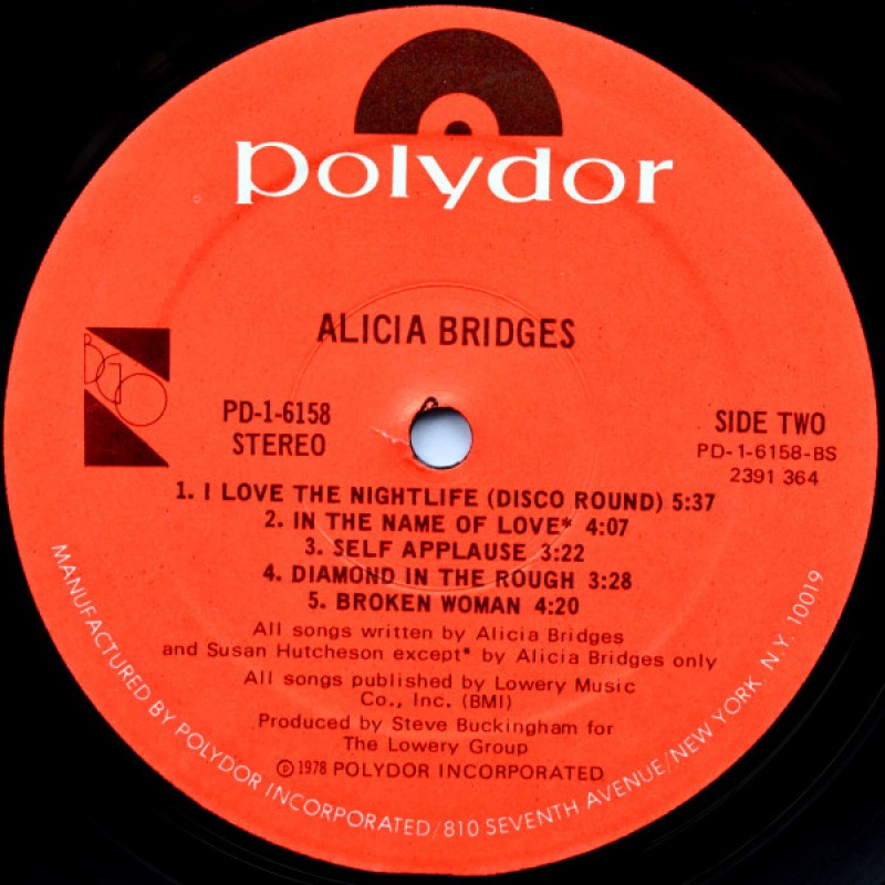 [l=PRC Recording Company, Compton, CA] pressing denoted by "PW" etch in runouts.Repress with the full 5:37 disco version of "I Love The Nightlife" (B1); first pressings used the 3:09 single edit.