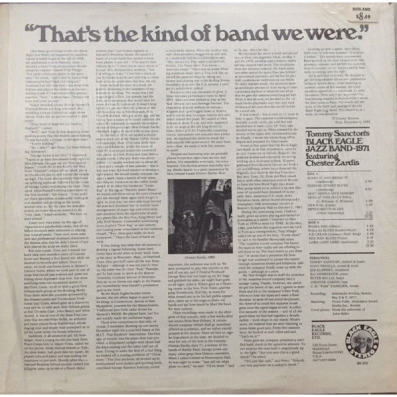Early recordings before the group had solidified officially into the New Black Eagles Jazz Band. Released many years after these recordings were made, with Tommy Sancton at the helm and featuring New Orleans legendary Jazz bassist Chester Zardis.Track duration times taken directly from record label.