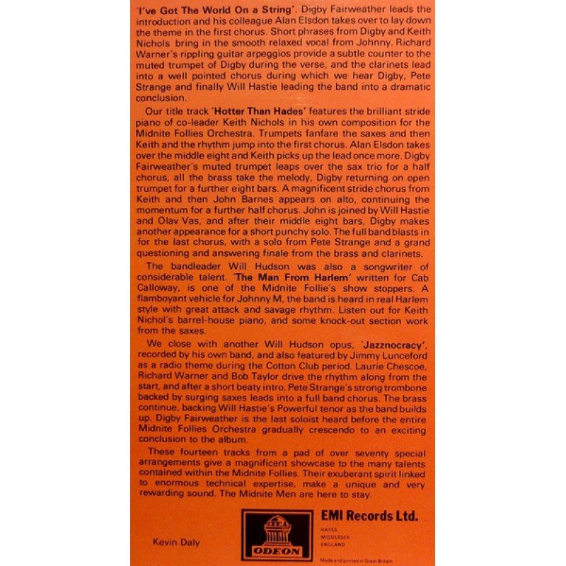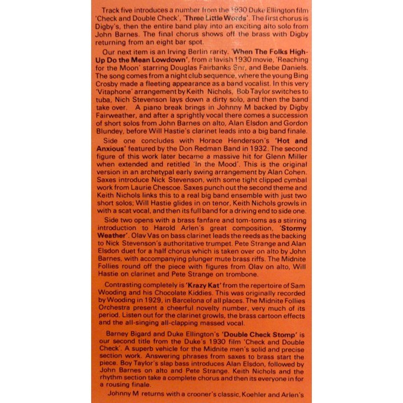 Track List | A1 Old Man Blues A2 No Strings A3 Midnite Follies A4 Minnie The Moocher A5 Three Little Words A6 When The Folks High Up Do The Mean Lowdown A7 Hot And Anxious B1 Stormy Weather B2 Krazy Kat B3 Double Check Stomp B4 I've Got The World On A String B5 Hotter Than Hade |