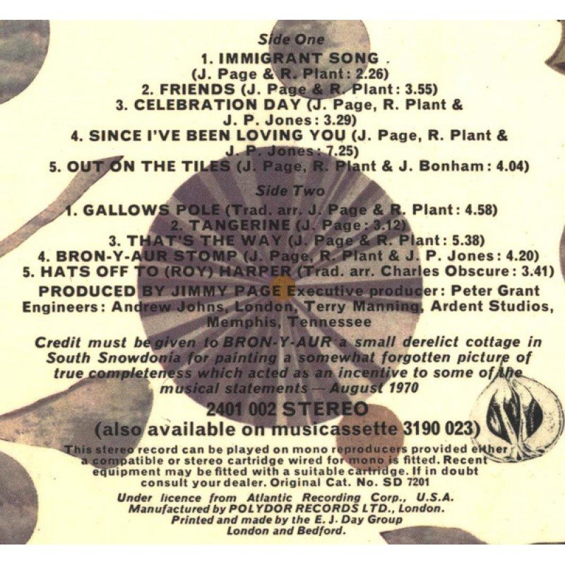 | Track List | A1 Immigrant Song A2 Friends A3 Celebration Day A4 Since I've Been Loving You A5 Out On The Tiles B1 Gallows Pole B2 Tangerine B3 That's The Way B4 Bron-Y-Aur Stomp B5 Hats Off To (Roy) Harper |