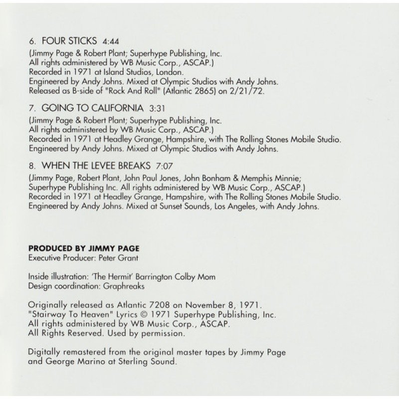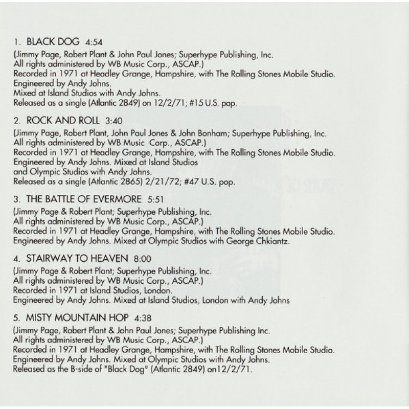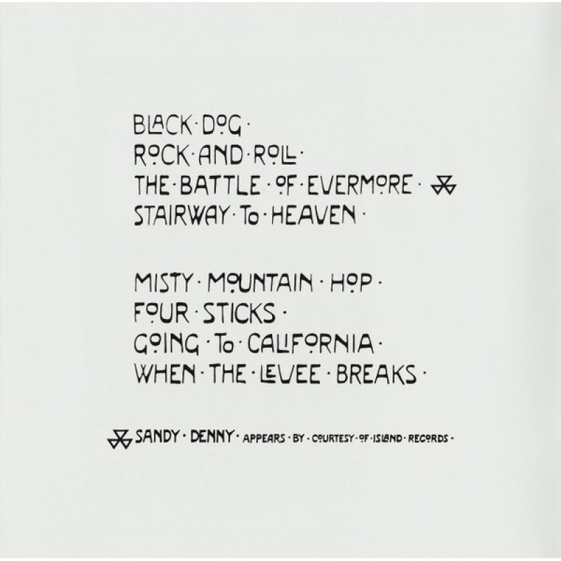 | Track List | 1 Black Dog 2 Rock And Roll 3 The Battle Of Evermore 4 Stairway To Heaven 5 Misty Mountain Hop 6 Four Sticks 7 Going To California 8 When The Levee Breaks |