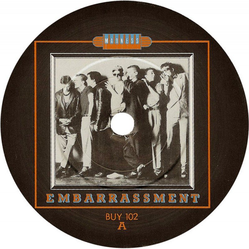 This edition has black picture labels. There is also an edition with [url=http://www.discogs.com/release/1511725]pink labels[/url]. Another black picture labelled edition exists as [url=http://www.discogs.com/Madness-Embarrassment/release/7774218]Lyntone pressing[/url].Cover is available with either a matt paper sleeve or a (thicker) glossy paper sleeve.