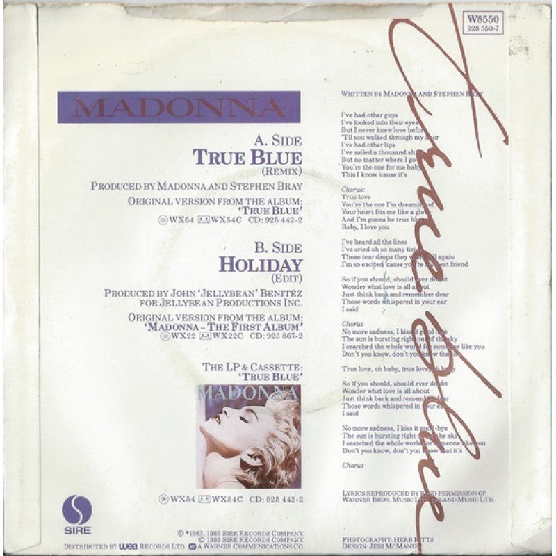 Silver injection-print labels on vinyl. In matt paper sleeve, full-color both sides.A-side ℗1986. From the album True Blue WX 54.