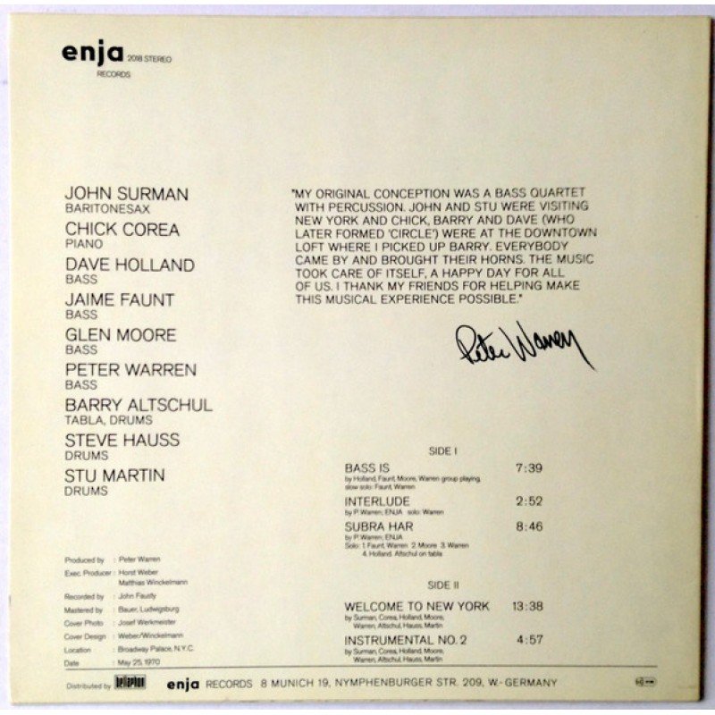 Liner Notes: "My original conception was a bass quartet with percussion. John and Stu were visiting New York and Chick, Barry and Dave (who later formed Circle) were at the downtown loft where I picked up Barry. Everybody came by and brought their horns. The music took care of itself, a happy day for all of us. I thank my friends for helping make this experience possible" - Peter Warren.