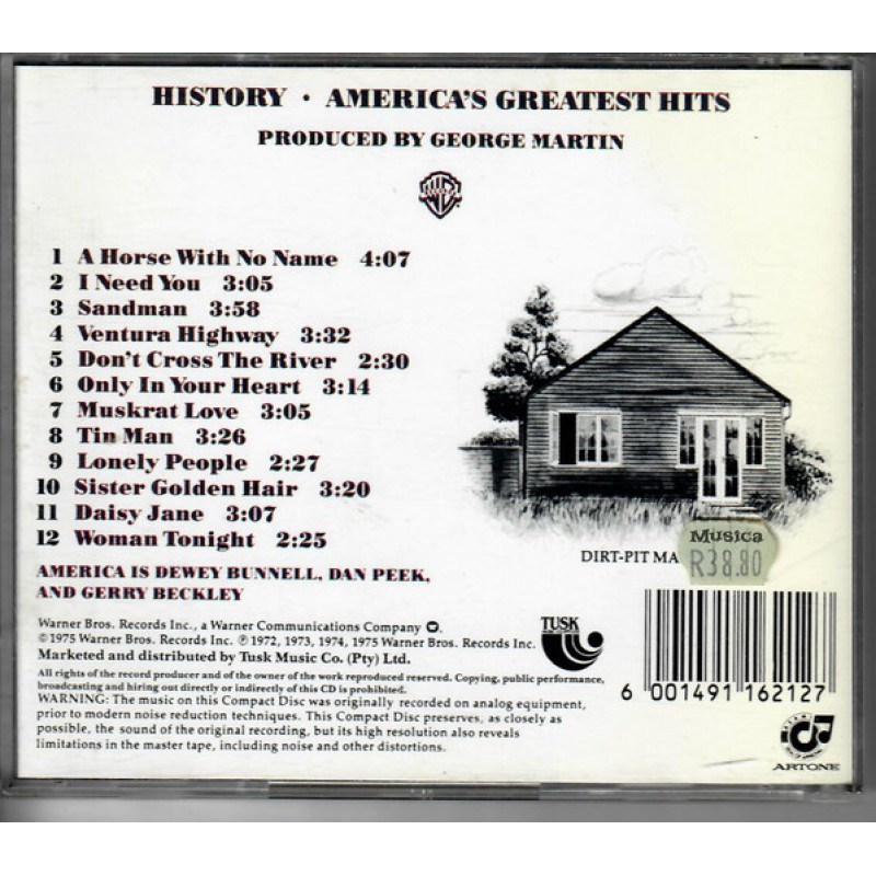 | Track List | 1 A Horse With No Name 2 I Need You 3 Sandman 4 Ventura Highway 5 Don't Cross The River 6 Only In Your Heart 7 Muskrat Love 8 Tin Man 9 Lonely People 10 Sister Golden Hair 11 Daisy Jane 12 Woman Tonight |