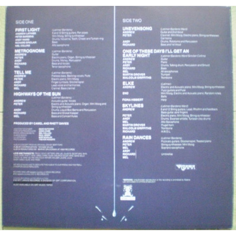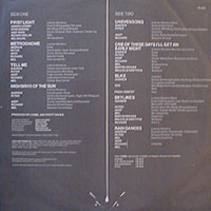 | Track List | A1 First Light A2 Metrognome A3 Tell Me A4 Highways Of The Sun B1 Unevensong B2 One Of These Days I'll Get An Early Night B3 Elke B4 Skylines B5 Rain Dances |
