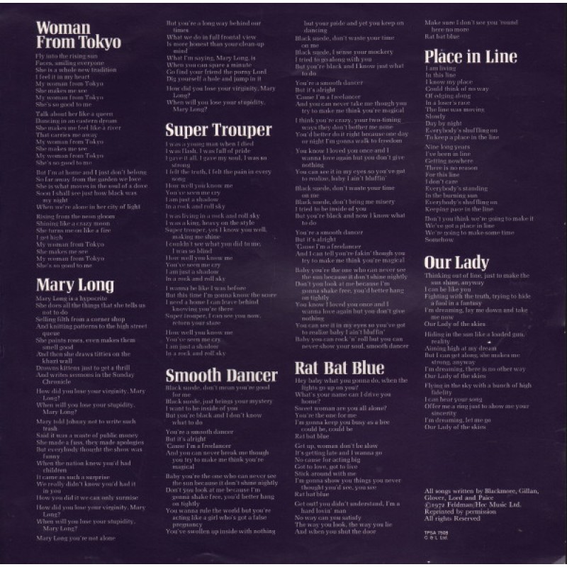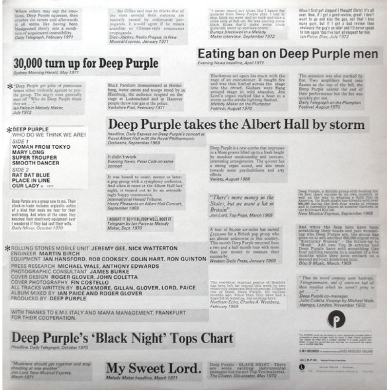 All songs written by Blackmore, Gillan, Glover, Lord and Paice