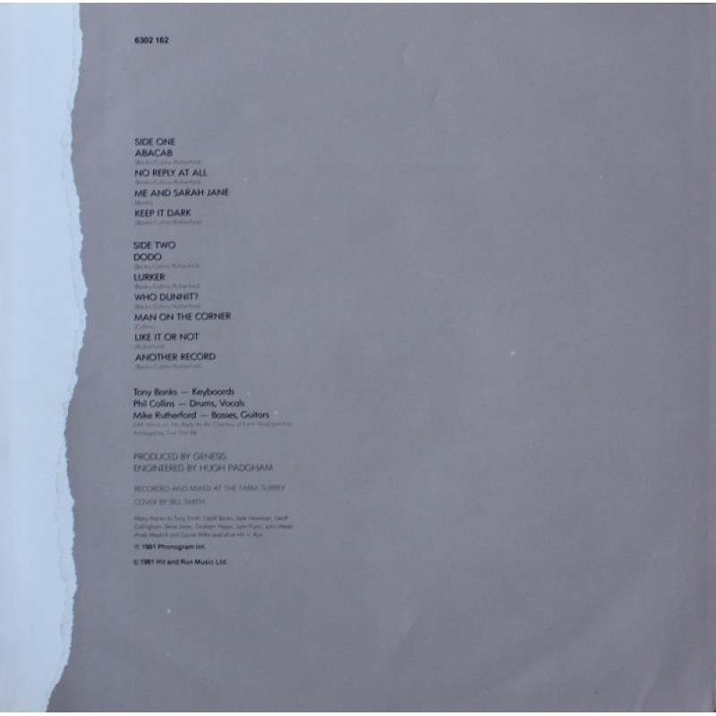 | Track List | A1 Abacab A2 No Reply At All A3 Me And Sarah Jane A4 Keep It Dark B1 Dodo B2 Lurker B3 Who Dunnit? B4 Man On The Corner B5 Like It Or Not B6 Another Record |