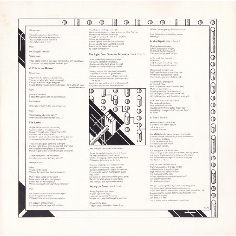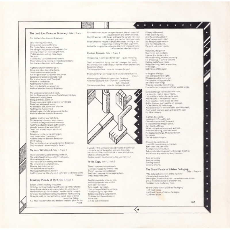| Track List | A1 The Lamb Lies Down On Broadway A2 Fly On A Windshield A3 Broadway Melody Of 1974 A4 Cuckoo Cocoon A5 In The Cage A6 The Grand Parade Of Lifeless Packaging B1 Back In N.Y.C. B2 Hairless Heart B3 Counting Out Time B4 The Carpet Crawlers B5 The Chamber Of 32 Doors |