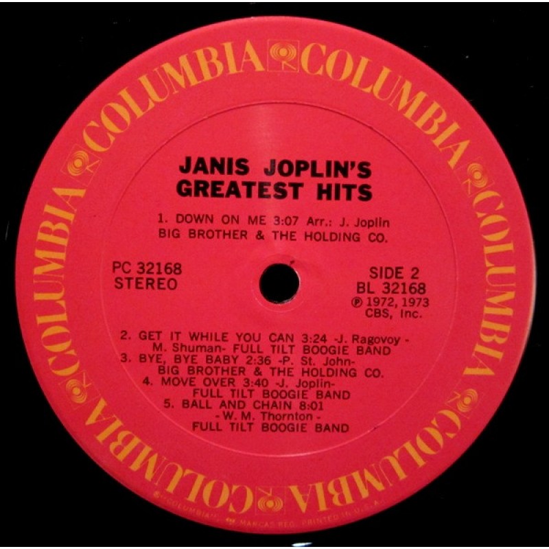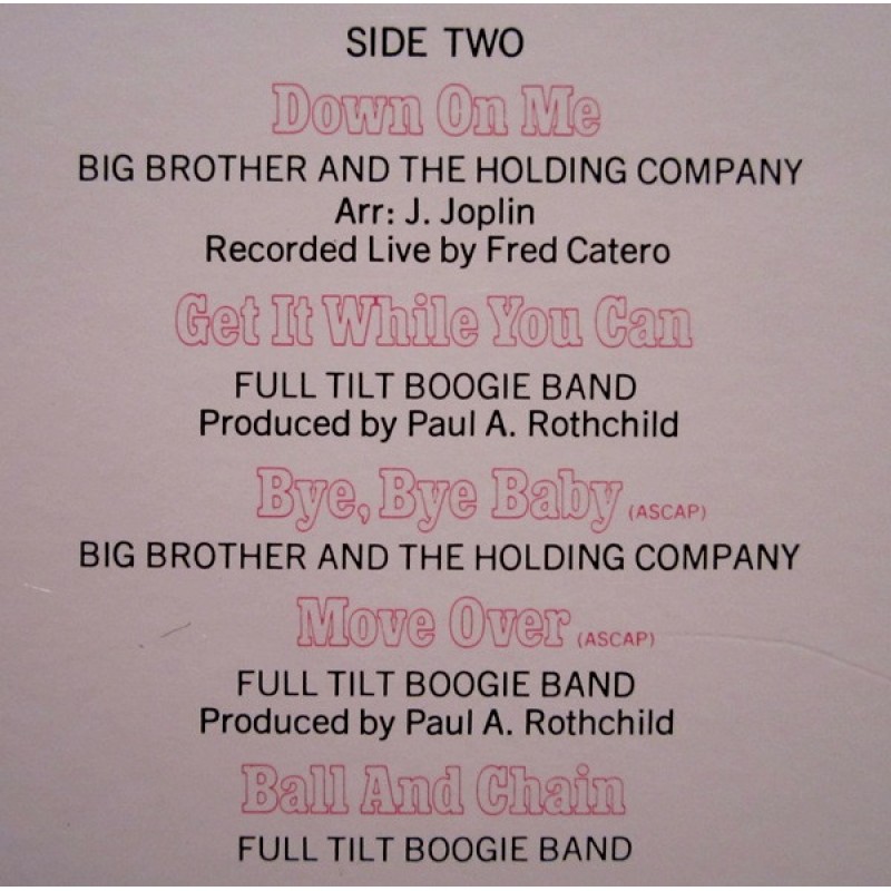 | Track List | A1 Piece Of My Heart A2 Summertime A3 Try (Just A Little Bit Harder) A4 Cry Baby A5 Me And Bobby McGee B1 Down On Me B2 Get It While You Can B3 Bye, Bye Baby B4 Move Over B5 Ball And Chain |