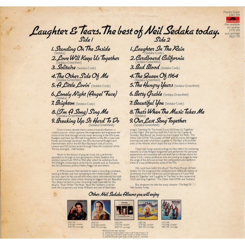 Title on spine and rear cover: Laughter & Tears. The Best Of Neil Sedaka Today.
