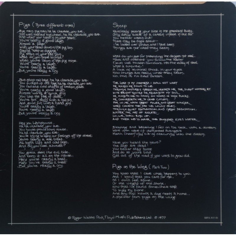 Black cardboard inner sleeve with lyrics on it. Rounded corners, and a 1/16" x 9" thumb cut on the edge that opens. In the lower right corner is the catalog number: SHVL 815 (I)