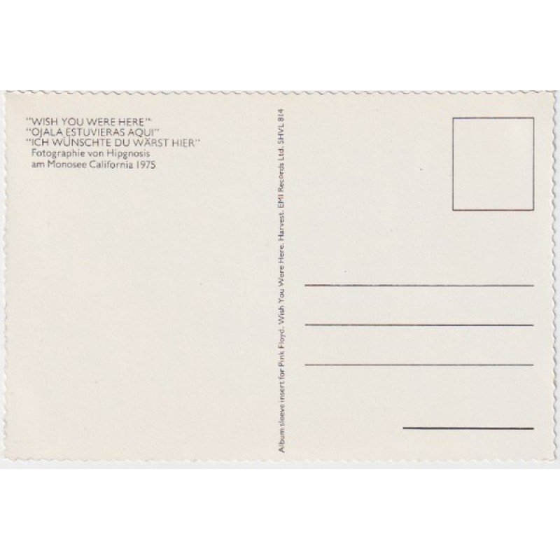 First issue.Released with the cover hidden under black shrink wrap with a round Wish You Were Here sticker on the outside of the shrink wrap. Spine is narrow (pinched) at the top and bottom and wide in the middle on some covers, and uniformed on others (like all spines). Issued with lyrics on a die cut inner sleeve and a glossy postcard, with jagged edges, of a diving man.