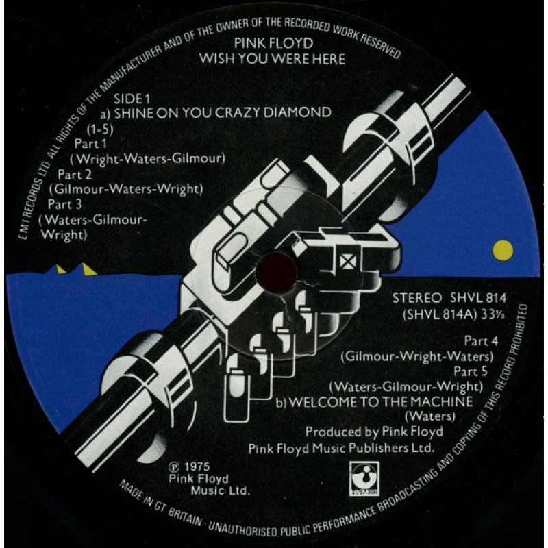 On label side 1, Shine On You Crazy Diamond Part 5 is credited to "Waters-Gilmour-Wright" (later have "Waters" only).